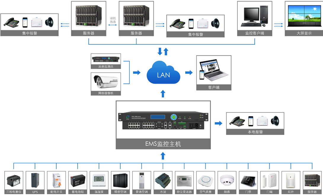 EMS系列監(jiān)控主機主要用以采集數(shù)據(jù)、處理數(shù)據(jù),可對環(huán)境、運行負(fù)載、設(shè)備溫升、局放工況、安防、視頻、消防、智能設(shè) 備等進行一體化監(jiān)控。在實際應(yīng)用中,與不同類型的傳感器相連,布線簡潔,操作方便。