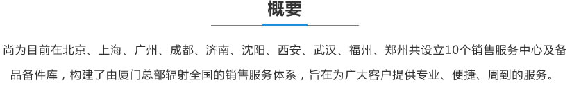 尚為目前在北京、上海、廣州、成都、濟南、沈陽、西安、武漢、福州、鄭州共設(shè)立10個銷售服務(wù)中心及備品備件庫,構(gòu)建了由廈門總部輻射全國的銷售服務(wù)體系,旨在為廣大客戶提供專業(yè)、便捷、周到的服務(wù)。